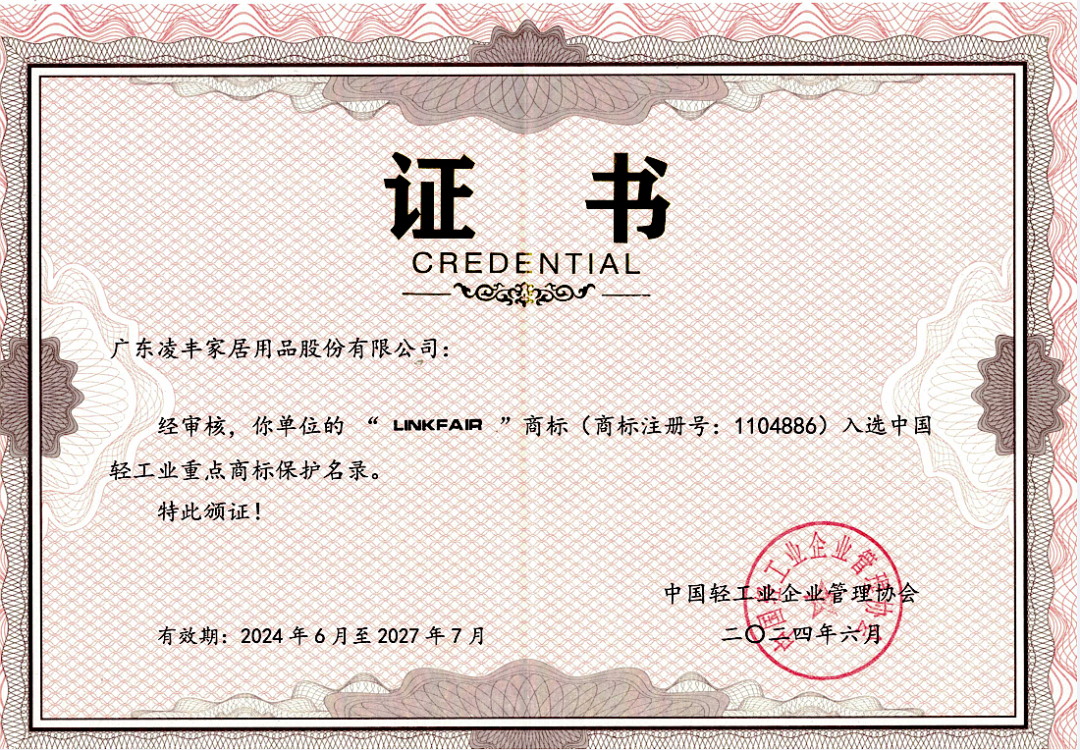 在近日召开的2024年中国轻工业知识产权大会上,中国轻工业企业管理协会现场发布了《第一批轻工业重点商标保护名录》,凌丰家品的“LINKFAIR”商标凭借其卓越的品牌影响力和深厚的行业积淀荣耀在列,成为首批受到加强保护的轻工业重点商标。 据了解,轻工业重点商标保护名录评选活动经过了企业申报、行业组织推荐、专家评审和网站公示等程序,秉持公平、公正原则进行严格审核,旨在推进轻工业商标品牌建设,加强重点商标保护,切实保护轻工业企业商标权人的合法权益,服务轻工业高质量发展。这次入选《第一批轻工业重点商标保护名录》的还有内蒙古伊利实业集团股份有限公司、广州立白企业集团有限公司等企业的130余项商标。 商标作为一种无形资产,是企业商誉和知名度的重要载体,也是企业竞争优势的重要来源。凌丰家品非常重视商标保护,建立了完善的商标保护机制,并通过产品、展会活动等载体,积极提升“LINKFAIR”等商标的知名度与影响力,用心为客户提供高质量的产品和服务,以此赢得消费者和市场的信赖。此次“LINKFAIR”商标成功入选《第一批轻工业重点商标保护名录》,是对凌丰多年来在品牌建设、技术创新和知识产权保护方面所取得成绩的高度肯定,也全面彰显了凌丰引领行业发展的品牌影响力。 今后,凌丰将进一步加强商标管理和品牌培育工作,继续深化知识产权与产业发展融合,加大科研创新力度,不断提升产品的品牌价值和市场竞争力,持续为消费者提供更优质的产品和服务体验,将“LINKFAIR” 商标打造成为具有知名度与美誉度的优质企业名片。